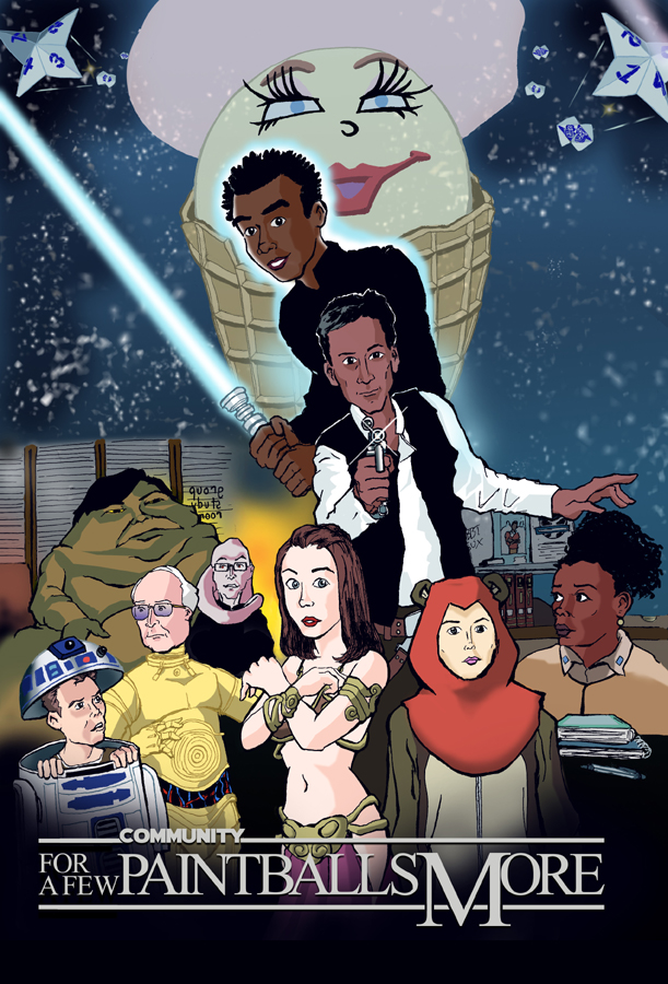 So I'm a huge fan of Dan Harmon's Community. Hell, I've been a fan of Dan since the Deadale Wives and Channel 101. Anyhow, from the minute Abed called dibs on playing Han Solo during the season 2 finale, I've been kicking around the idea for this. Of course, it's based on the poster for Return of the Jedi, which I've had a soft spot for since I was a kid. 3-Peirce-O and R2-Winger are a cheat since the droids aren't on the original poster, but it seemed like a fair compromise.